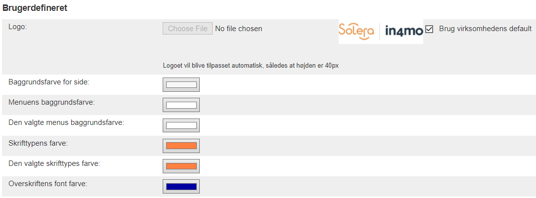 Først tilpasser du farveskemaet for kundesiden ved at indstille siden til de ønskede farver, f.eks. til det farveskema, som din virksomhed bruger i sin dokumentation og / eller webside. Du indstiller farverne ved at klikke på farveknapperne for hver række og vælge den rigtige farve. Hvis du ikke ønsker at bruge virksomhedslogoet (som defineret under Virksomhed> Oversigt) på kundesiden, skal du fjerne markeringen i afkrydsningsfeltet ‘Brug virksomhedens default’ og vælge et andet logo.