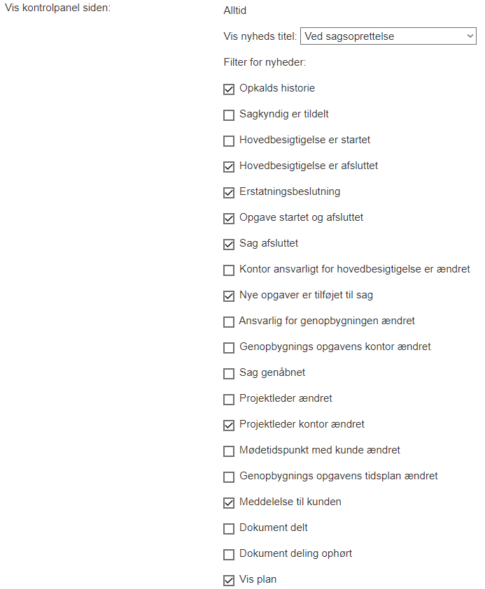 Vis nyheds titel: Her kan du vælge, om og hvornår nyhedsfeed feltet skal være synligt for kunden; ved oprettelse af sager, når en sagkyndig er blevet tildelt, efter en positiv erstatningsbeslutning eller aldrig. For at få noget indhold til nyhedsfeed skal du vælge de muligheder, du ønsker under Filter for nyheder:
