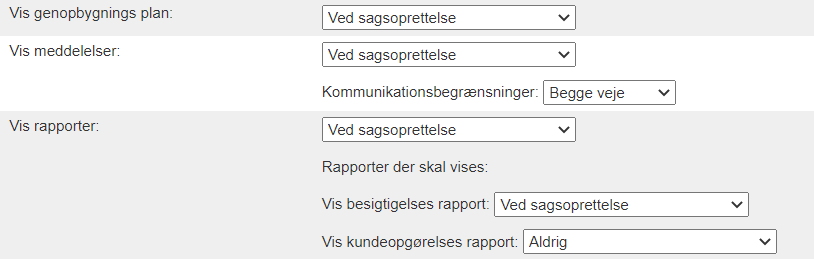 Vis genopbygnings plan– tilføjer en fane til kundesiden, hvor kunden kan se på projektplanen. Det er muligt at definere, hvornår siden med projektplanen bliver tilgængelig; ved oprettelse af sager, når en sagkyndig er tildelt, efter en positiv erstatningsbeslutning eller aldrig.