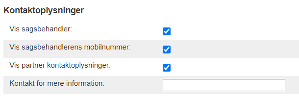 Vis sagsbehandlerens mobilnummer– Hvis den er aktiveret, vises sagsbehandlerens telefonnummer i sagsoplysningerne på kundesiden (kræver, at sagsbehandlerens navn vises).