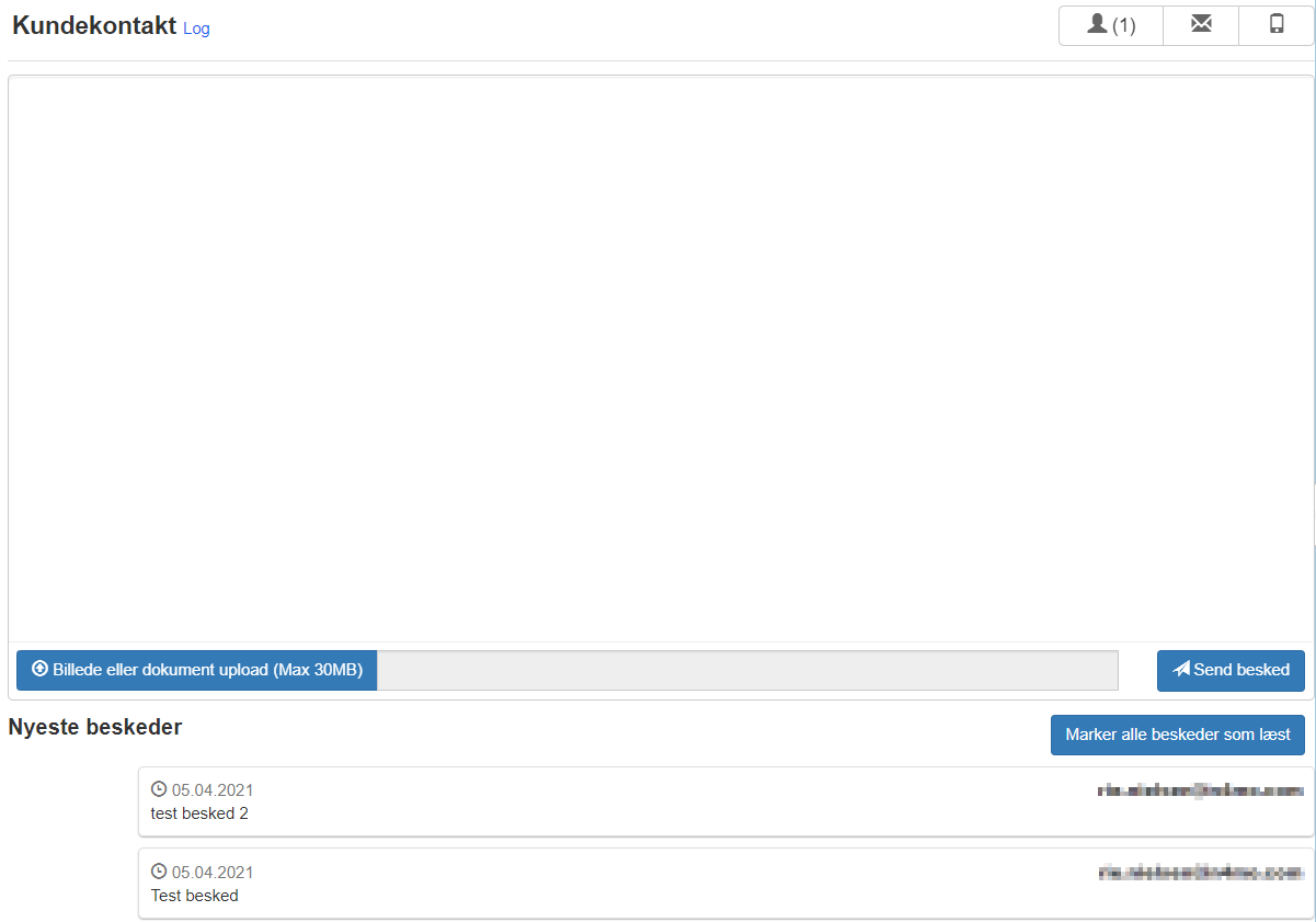 Den hvide boks er et meddelelsesfelt, hvor du kan skrive beskeder, der skal føjes til kundesiden. Det er også muligt at uploade billeder eller dokumenter. Alle meddelelser, inklusive dokumenter, vises nedenfor med den nyeste besked først, og e-mailadressen til den person, der sendte hver besked, vises. For meddelelser, du sender til kunden, vises navnet på den person, der sender beskeden. Over meddelelserne finder du knappen ‘Marker alle beskeder som læst’. Ved at klikke på denne knap markeres meddelelserne som læst, hvilket fjerner den blinkende røde pil og sagen fra kontrolpanelet under feltet for nye kunde uploads eller beskeder.