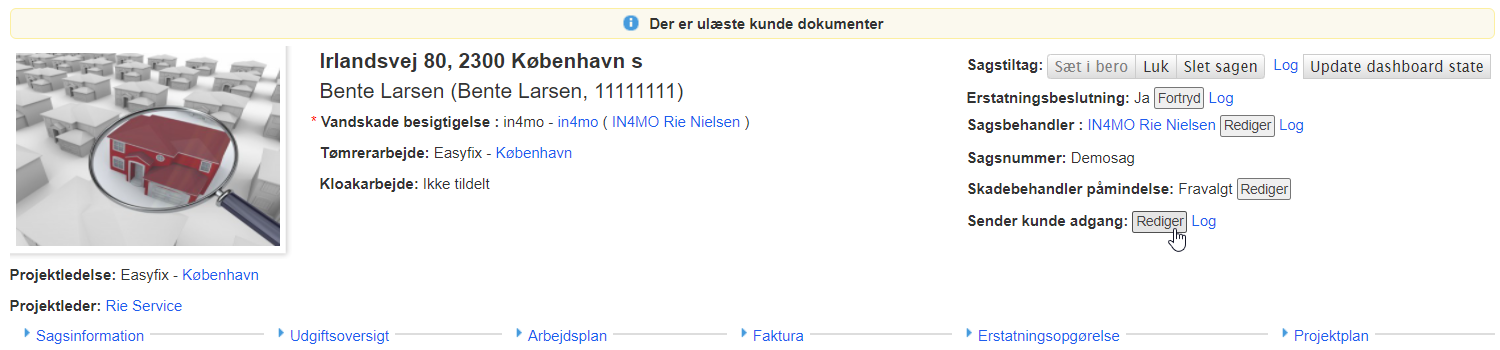 Uanset hvad de generelle indstillinger for kundesidedeling er for portalen, kan indstillingerne ændres i individuelle tilfælde. Dette gøres i sagen ved at trykke på ‘Sender kunde adgang’.