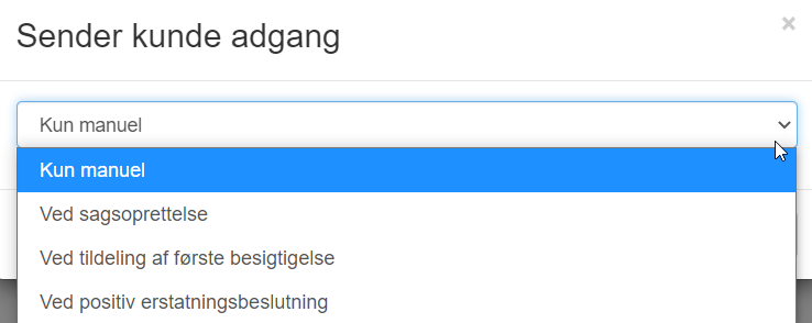Vis rapporter– Giver kunden adgang til dokumentfanen, hvor han eller hun kan se dokumenter fra sagen. Det er muligt at definere, hvornår dokumentsiden skal gøres tilgængelig; ved oprettelse af sager, når en sagkyndig er tildelt, efter en positiv erstatningsbeslutning eller aldrig. Det er også muligt at definere, om besigtigelses rapporten og/eller kundeopgørelses rapporten skal deles automatisk, og hvornår. Det er også muligt at dele dokumenter fra sagen manuelt, hvilket vil blive forklaret senere i denne vejledning.