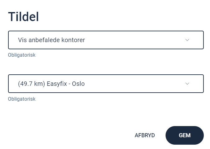 | Vis kontorkategorier | De kontorkategorier, som forsikringsselskabet har defineret for at sikre optimale opgaver, kan bruges ved tildeling af opgaver |