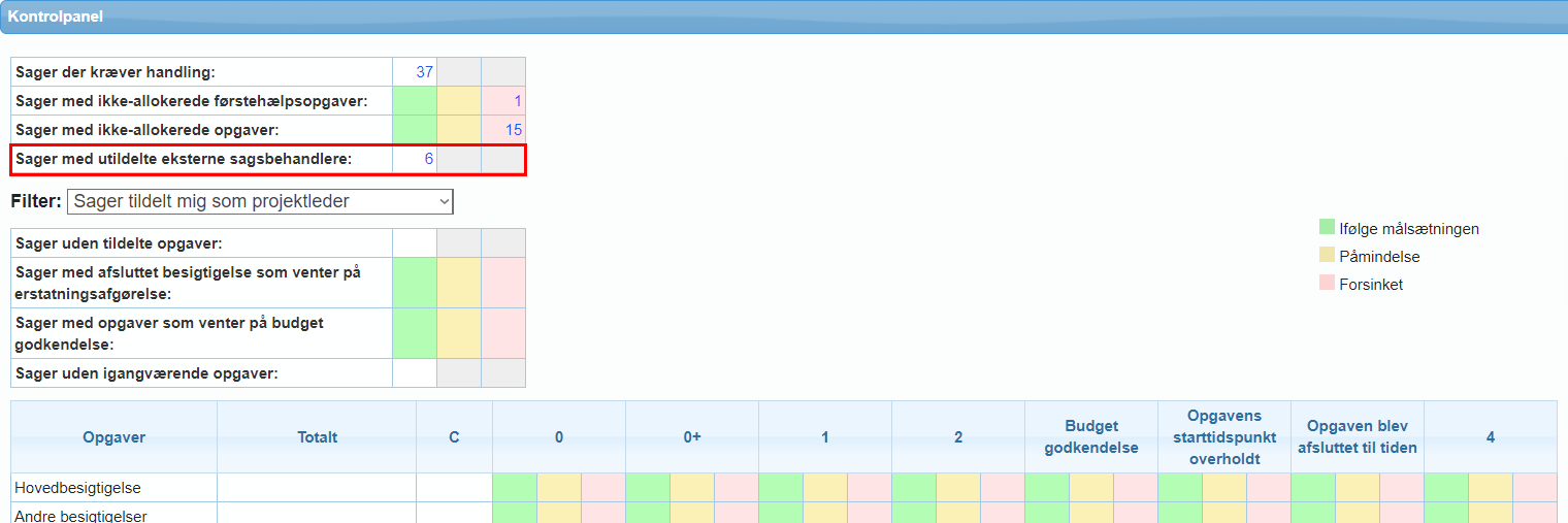 I kontrolpanelet er filteret Sager tildelt mig som en ekstern sagsbehandler tilgængeligt, så snart brugeren er markeret for rollen i deres brugerprofil.