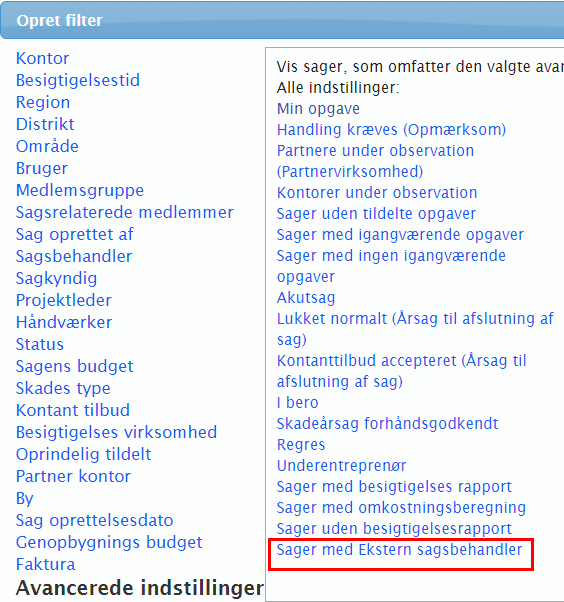 Filtre for Ekstern sagsbehandler