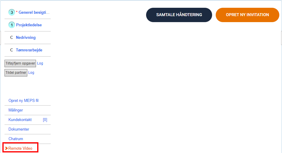Når du åbner en sag i in4mo Building Claims og har løsningen aktiveret, vil der være en menu i venstre side for Remote Video.