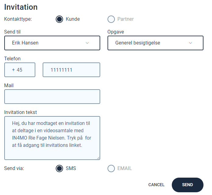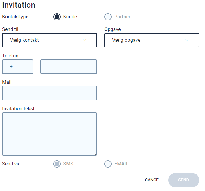 Det er mulighed for at vælge, om invitationen skal sendes via e-mail eller sms, afhængigt af detaljerne i den valgte kontakt. Hvis kun telefonnummer er tilgængeligt, er det kun muligt at vælge SMS og omvendt.