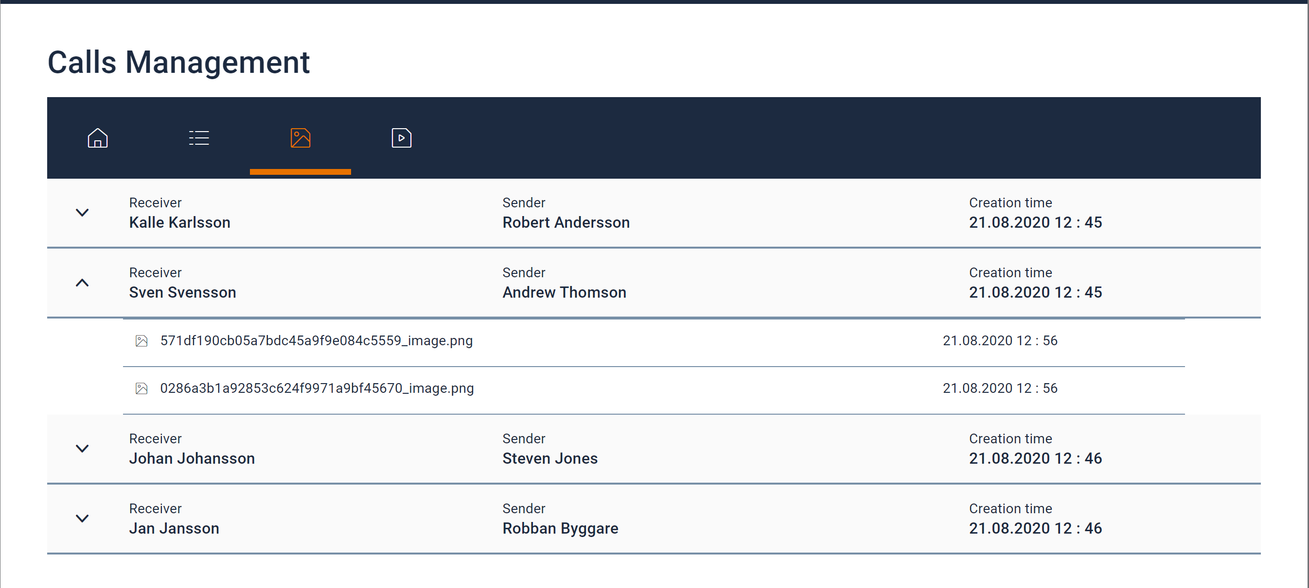 Når du vælger billedfanen, vises de billeder, der er taget for alle opkald i sagen. Billederne vises pr. Opkald med mulighed for at udvide og skjule elementerne for en bestemt invitation. Ved at klikke på et emne åbnes billedet i et nyt vindue.