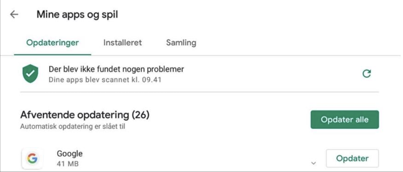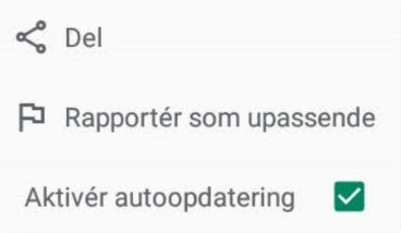 Når der er en tilgængelig opdatering til appen, kan du manuelt opdatere appen ved at trykke på ‘Opdater’ på appens side. Du kan også kontrollere opdateringer for alle apps ved at trykke på menu knappen i Play Butik og vælge ‘Mine apps og spil’, hvor du kan se en liste over alle apps, for hvilke der er opdateringer tilgængelige. Du kan derefter vælge at opdatere alle apps ved at trykke på ‘Opdater alle’ eller at opdatere individuelle apps ved at trykke på knappen ‘Opdater’ i samme række som den app, du vil opdatere.