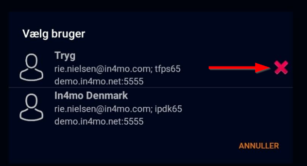 En liste over alle tilføjede konti åbnes. For at fjerne en konto skal du trykke på det røde kryds i højre side af den konto, du vil fjerne. Der vises en meddelelse, der beder dig om at bekræfte, at kontoen fjernes. Tryk på accept, og kontoen fjernes permanent fra appen.