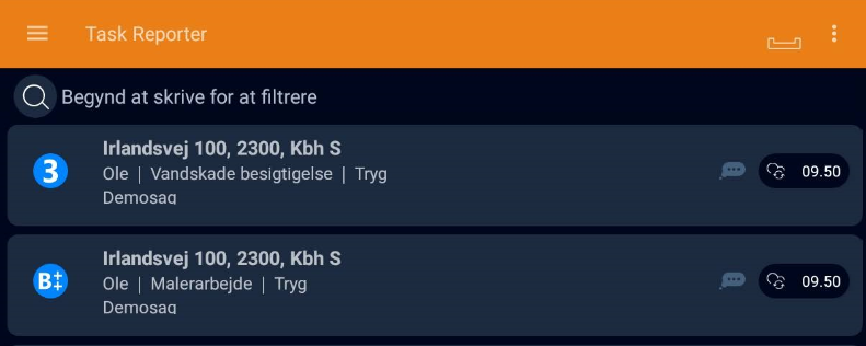 Startskærm på appen er opgavelisten. Denne liste viser aktive opgaver, der er tildelt denne bruger. Besigtigelsesopgaver forbliver på opgavelisten også efter at være afsluttet, mens andre opgaver automatisk fjernes fra appen, når de markeres som afsluttet. Det er også muligt at fjerne afsluttede besigtigelser fra appen, som vil blive beskrevet senere.