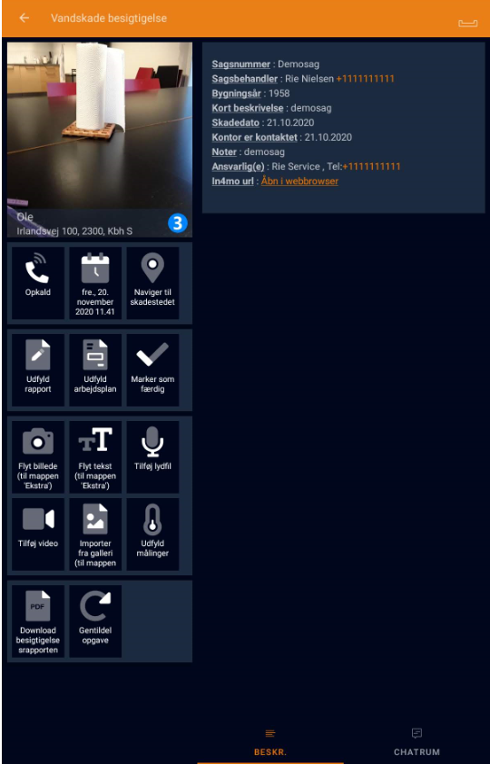 På en tablet vil du se de tilgængelige handlinger i venstre side af skærmen og sagsoplysninger på højre side. Du kan skifte mellem sagsoplysninger og chatrummet nederst til højre.