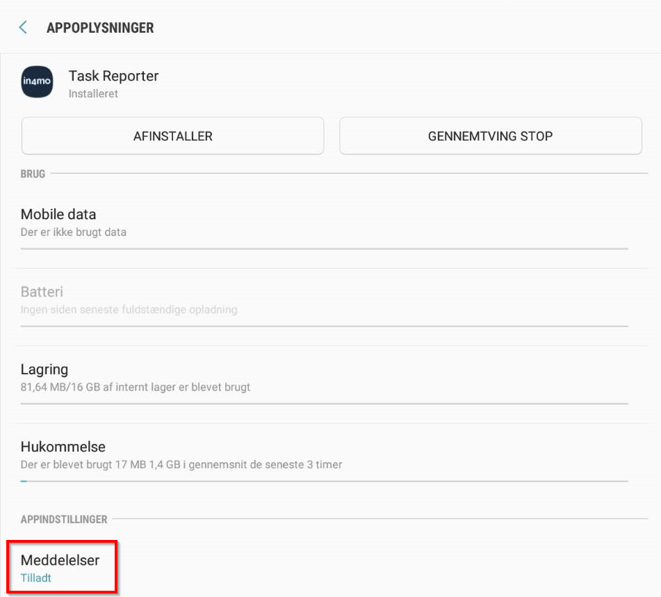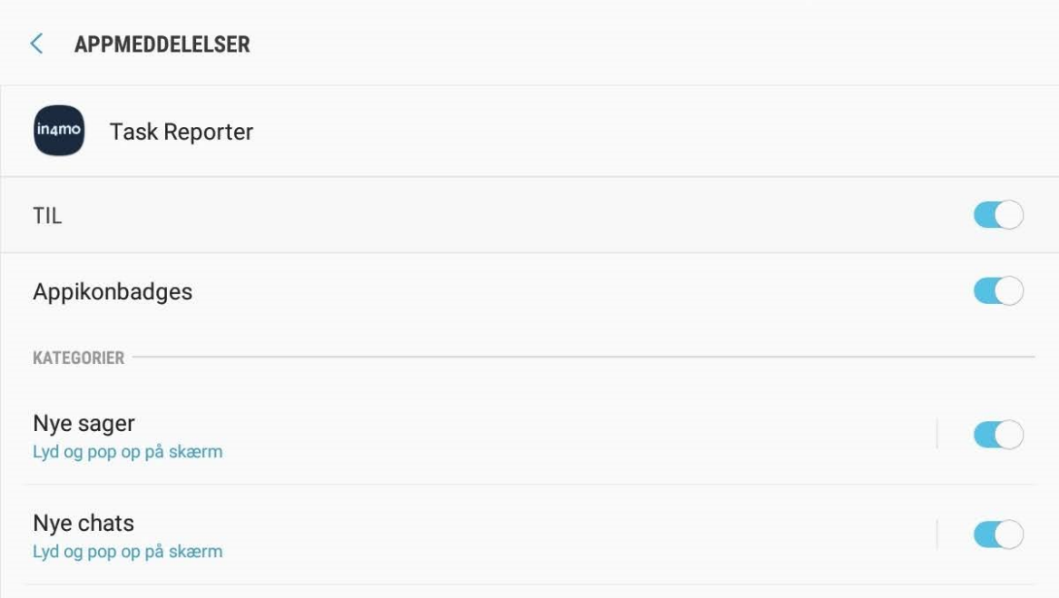 - Der er to forskellige steder, hvor du skal kontrollere meddelelsesindstillingerne. Under indstillingerne i in4mo Task Reporter-appen er der separate indstillinger for, hvorvidt der skal modtages meddelelser om chats og nye sager. Kontroller, at disse er aktiveret.Gå derefter til enhedens indstillinger. Her skal du kigge efter en liste over apps med apptilladelser osv. Præcis hvor du finder dette kan variere mellem forskellige enheder. Når du finder dette afsnit af indstillingerne, skal du kigge efter Task Reporter og trykke på det. Du vil se, at der app har sine egne indstillinger for meddelelser. Tryk på ‘Notifikationer: