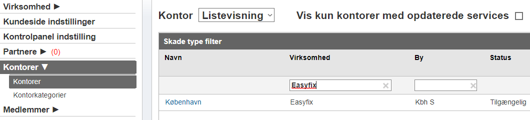 Rettigheder til at skabe akut sager gives på kontorniveau, hvilket betyder, at retten gives til et bestemt kontor snarere end for hele partneren. For at give eller fjerne retten til at oprette akut sager skal du gå til Virksomheds admin -> Kontorer. Fra kontors listen skal du finde det kontor, du leder efter, og derefter klikke på navnet på kontoret, der findes under kolonnen Navn.