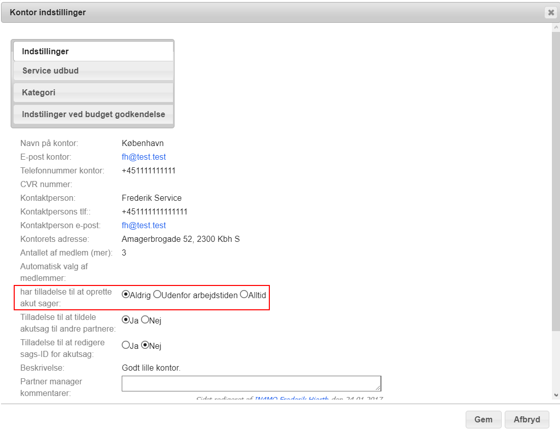 Mulighederne her er Aldrig, Uden for arbejdstid og Altid. Aldrig vælges som standard for alle kontorer, hvilket betyder, at ingen kontorer er i stand til automatisk at oprette akut sager. Når et kontor har fået tilladelse til at oprette akut sager, kan medlemmer fra dette kontor oprette akut sager, enten uden for den arbejdstid, der er defineret i portalen, eller altid. Husk at klikke på Gem, når du har foretaget ændringer.