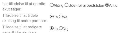 Det er også muligt at give partnere ret til at tildele akut sager til andre partnere og at definere sags-id for akut sager. Disse yderligere rettigheder kan kun gives, hvis den udvidede akut sagsfunktionalitet er aktiveret i portalen.