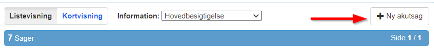Når en bruger fra et kontor, der har fået ret til at oprette akut sager (og tiden er uden for den definerede arbejdstid, hvis rettighederne til at oprette akut sager kun gives uden for arbejdstiden) åbner sagslisten, brugeren finder en knap kaldet + Ny akutsag øverst til højre på sagslisten.
