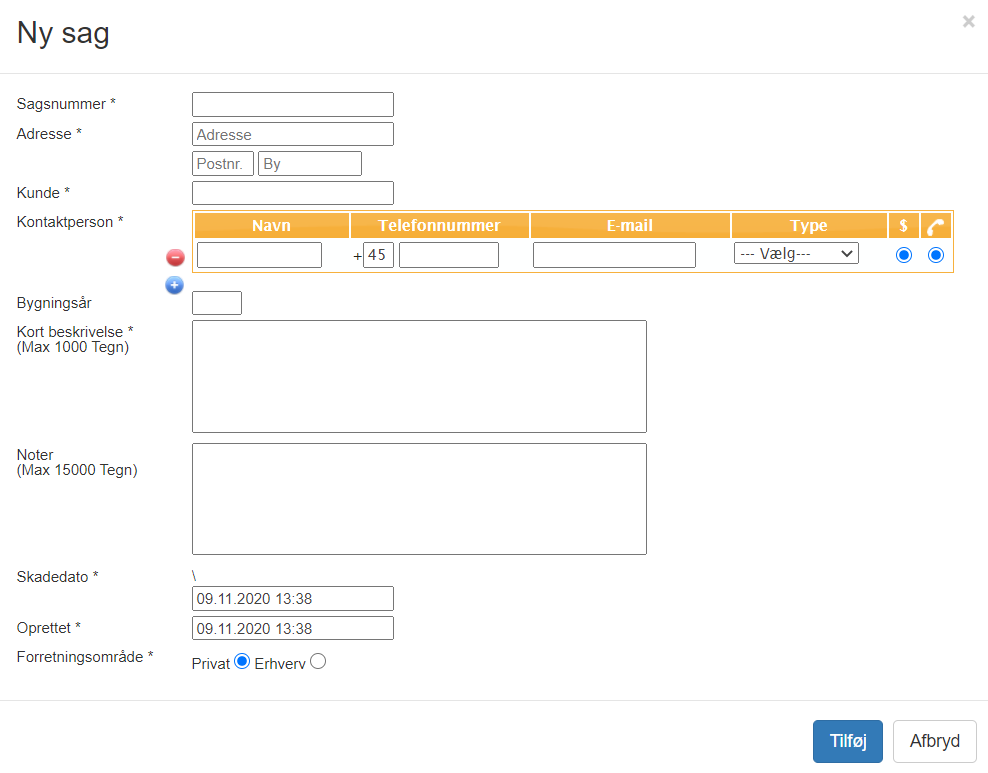 Felter, der er obligatoriske at udfylde, er markeret med et stjerneikon (*), andre felter er valgfri. Når du er klar, skal du klikke på Tilføj for at tilføje sagen.