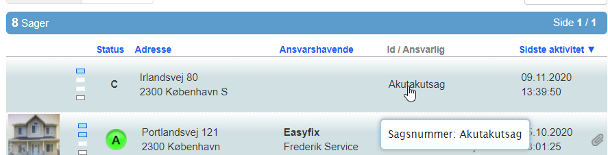 Den nyoprettede sag føjes til sagslisten hos virksomheden der oprettede sagen, med ordet Akut i sit Id. Sagen kan åbnes på samme måde som andre sager ved at klikke på den. Når du har åbnet sagen, kan du tildele førstehjælpsopgaven (og/eller besigtigelsesopgaven) og fortsætte som normalt. Førstehjælpsopgaver kræver ikke et budget, hvilket betyder, at du når som helst kan begynde at rapportere.