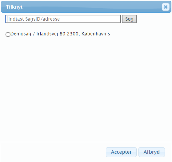 Hvis der trykkes på Tilknyt, vil brugeren være i stand til at linke den akut sag til en anden sag, der allerede findes i portalen.