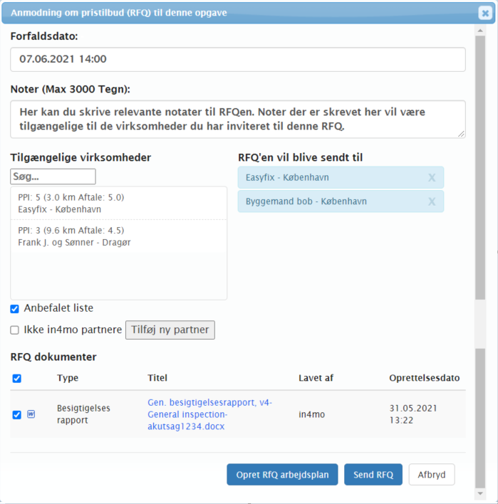 Listen Tilgængelige virksomheder viser kontorer, som du kan sende RFQ til. Som standard viser listen den anbefalede liste. Du kan vise hele kontor listen ved at fjerne markeringen fra afkrydsningsfeltet Anbefalet liste under listen. Ved at markere afkrydsningsfeltet Ikke-in4mo-partnere viser listen alle ikke-in4mo-partnere, der er tilføjet til portalen, og som er tilgængelige for den/de opgavetyper, der er inkluderet i RFQ. Ved at klikke på knappen Tilføj ny partner er det muligt at tilføje en ny ikke-in4mo-partner, som vil blive inkluderet i RFQ. Du kan definere, om dette firma kun skal være tilgængeligt via RFQ’er, eller om det også skal være tilgængeligt gennem normal opgavetildeling på samme måde som andre ikke-in4mo-partnere. Virksomheder, der vil modtage RFQ, er angivet på højre side. Hvis du ønsker at fjerne et firma fra listen, kan du gøre det ved at klikke på X ved siden af det kontor, du vil fjerne.