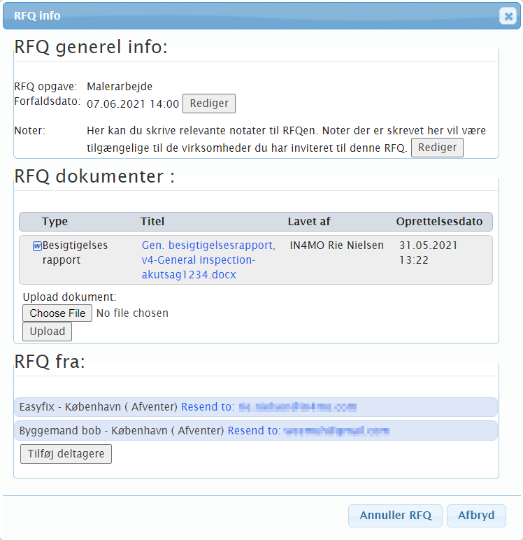 Mens en RFQ stadig er i gang, er det muligt at ændre forfaldsdatoen for indgivelse af et tilbud (f.eks. Forlænge fristen for at få flere tilbud), redigere notatfeltet, tilføje dokumenter, sende RFQ-invitationen igen til deltagere, der har endnu ikke afgivet et tilbud eller afvist at gøre det, og det er også muligt at tilføje flere deltagere til RFQ.