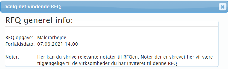 Når deadline for en RFQ er udløbet, er det tid til at beslutte resultatet for RFQ. Det er muligt at vælge et vindende tilbud eller vælge, at der ikke er noget vindende tilbud, samt at forlænge fristen, hvilket giver deltagerne mere tid til at afgive tilbud, hvis nogle mangler, og sende invitationen til RFQ til flere virksomheder.