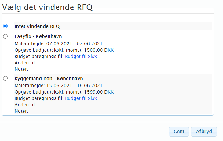 For at vælge et vindende tilbud skal du markere det vindende tilbud og klikke på Gem nederst til højre. Hvis du vælger Intet vindende RFQ, går opgaven tilbage til status C. Hvis du vælger et vindende tilbud, tildeles den valgte partner opgaven, og budgettet tilføjes automatisk til udgiftsoversigt fanen. Hvis vinderen er fra partnernetværket i portalen, vil den valgte ansvarlige person også automatisk blive tildelt opgaven.