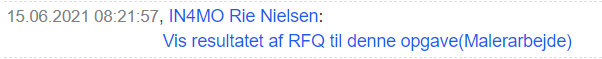For at se resultatet af RFQ skal du først vælge den pågældende opgave. Under Opgave information vil der nu stå Check resultatet af RFQ’en. Klik på den blå tekst for at åbne resultatet af RFQ.