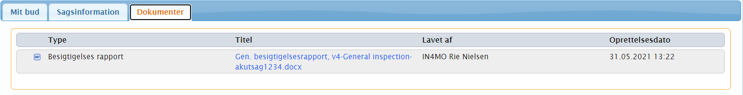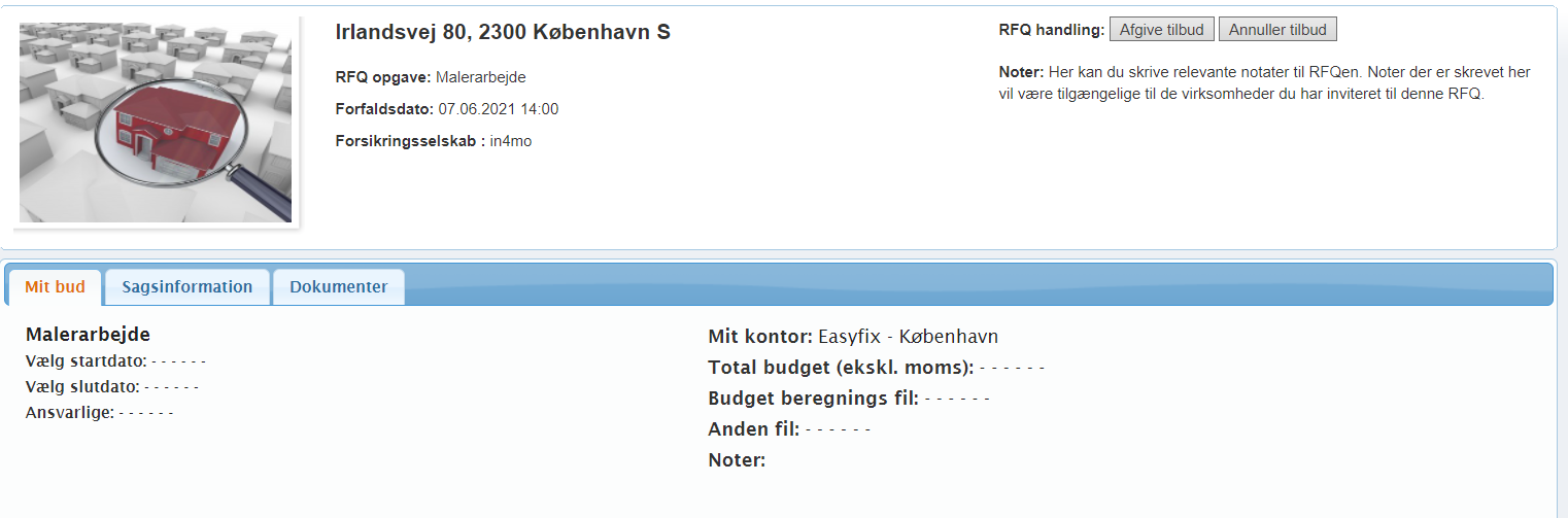 Når en RFQ indledes, modtager de inviterede parter en e-mail, der giver adgang til RFQ via et link. Når du klikker på dette link, åbnes RFQ-siden i en browser. Her har du adgang til at se oplysninger om sagen samt til at afgive et tilbud eller beslutte ikke at afgive et tilbud. Du finder tre faner på siden: Mit bud, Sagsinformation og Dokumenter.