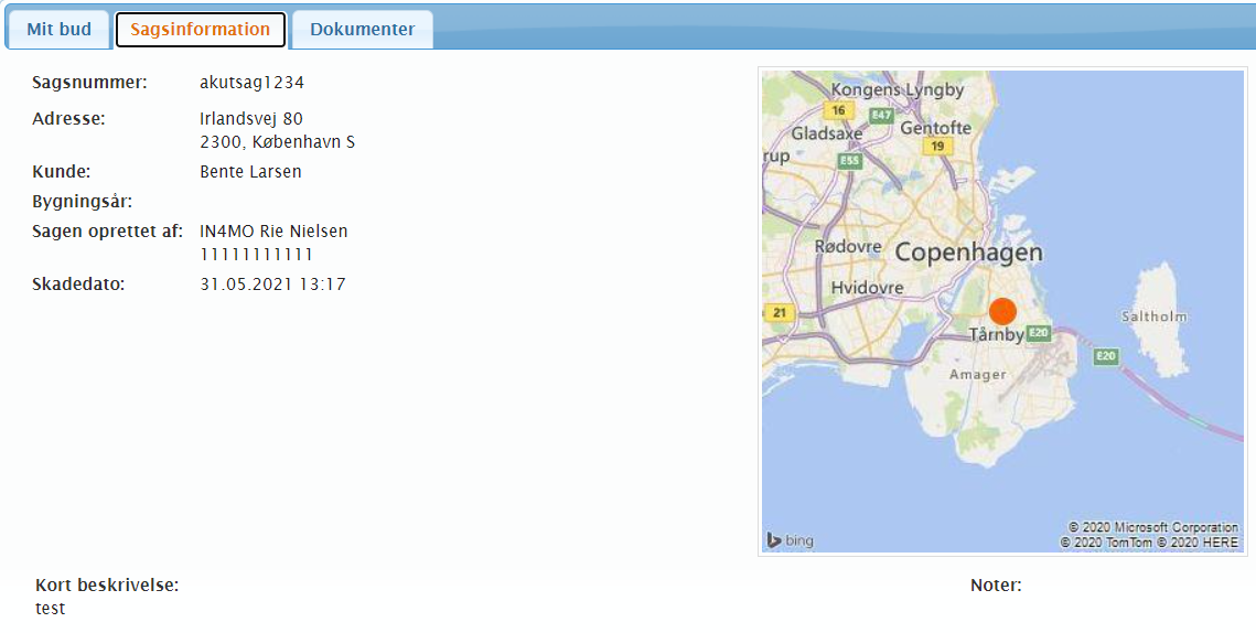 Under Sagsinformation finder du grundlæggende oplysninger om sagen, såsom skadestedets adresse, samt en kort beskrivelse og noter fra sagen.