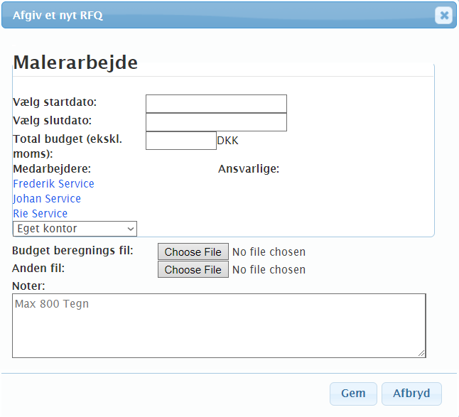 Når du klikker på Angive tilbud, vises et nyt vindue. Det er fra dette vindue, du afgiver dit tilbud. Vælg en start- og slutdato for opgaven, den samlede sum af dit tilbud (ekskl. Moms), vælg hvem der vil blive indstillet som den ansvarlige person for opgaven, og vedhæft derefter en budgetfil. Du kan også vedhæfte en anden fil, hvis du har flere dokumenter, der er relevante for tilbuddet. Nederst kan du tilføje noter til dit tilbud, som vil være tilgængelige for den person, der vælger det vindende tilbud. Når du er klar, skal du klikke på Gem. Dit tilbud er nu indsendt og kan ses på siden RFQ under Mit bud, så længe RFQ er åben. Det er også muligt at foretage ændringer i dit tilbud indtil forfaldsdatoen for RFQ.
