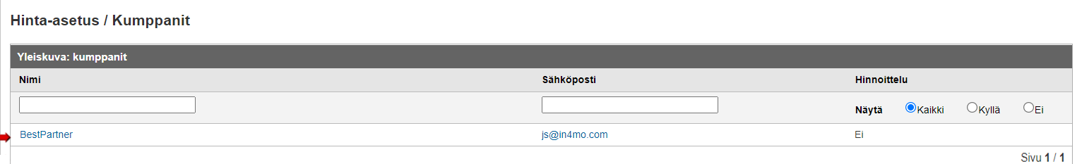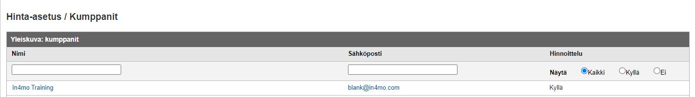 Kohdassa Kumppanit löytyy luettelo kaikista portaalin kumppaneista. Luetteloa voi suodattaa sen mukaan haluaako nähdä luettelon yrityksen nimen, yrityksen sähköpostiosoitteen mukaan tai valinnaisesti, nähdä luettelossa kaikki tai vain ne yritykset, joilla on tai ei ole määritetty hinta-asetuksia.