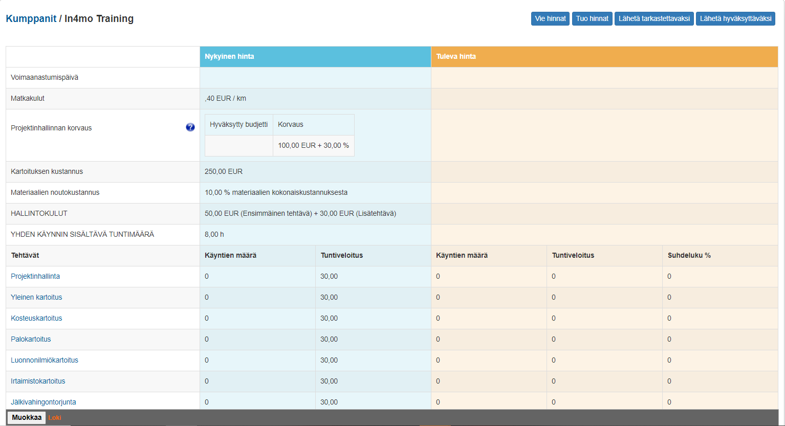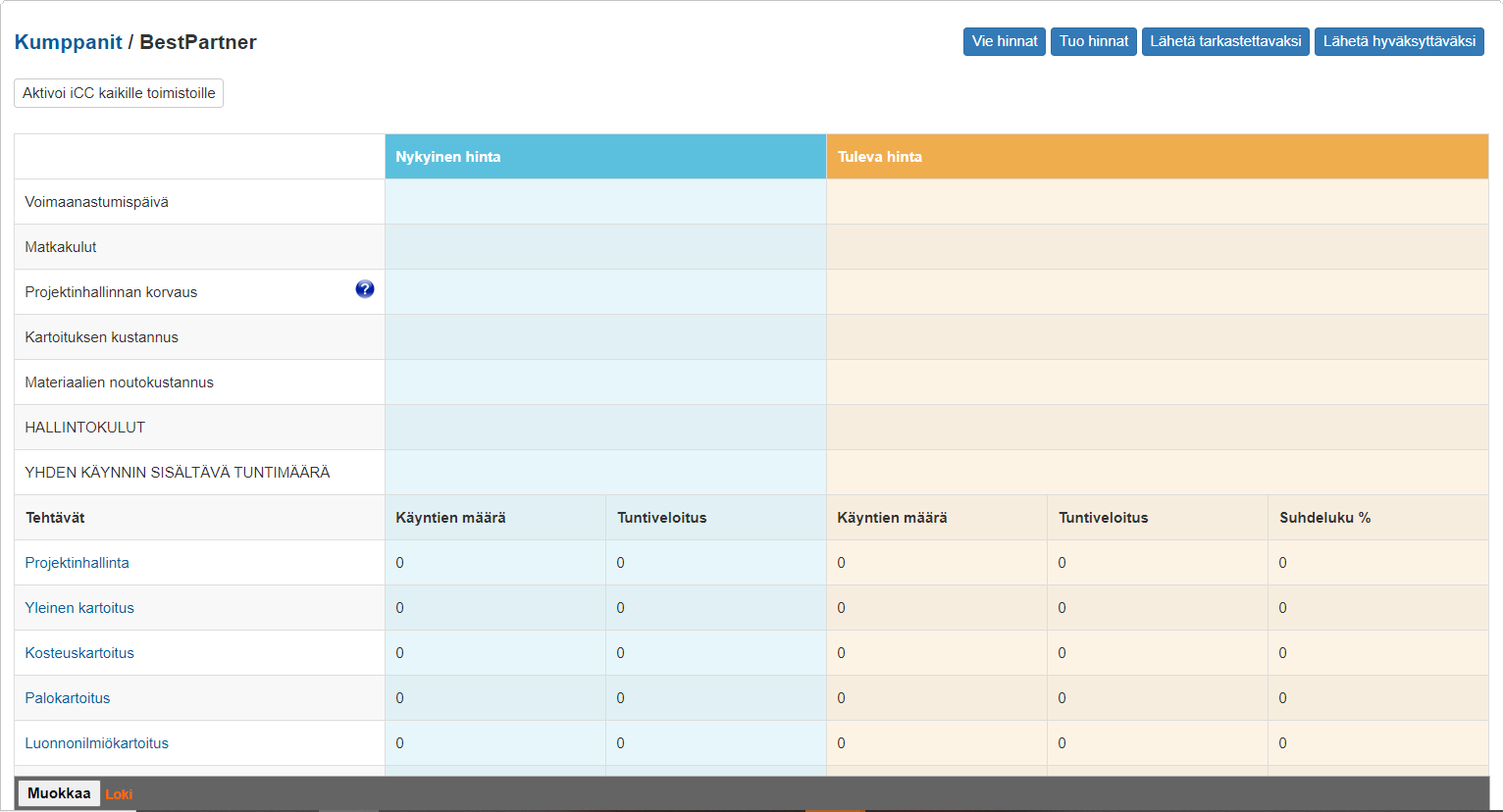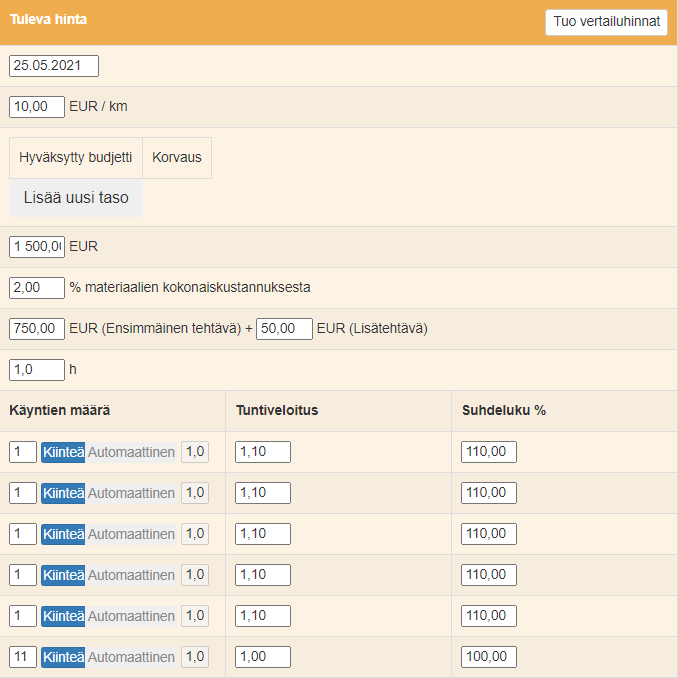 Klikkaamalla Muokkaa -painiketta, voi asettaa uusien hintojen aktivointipäivän, sekä tehdä muutoksia kunkin tehtävän yleisiin hintoihin, matkojen määriin ja tuntiveloitukseen. Oikealla on sarake nimeltä Suhdeluku %. Tätä voidaan käyttää tuntikohtaisen sarakkeen sijasta muutosten tekemiseen, esimerkiksi mikäli Timpurityöt nousee tuntitasolla 5 %, voi Timpurityön riville lisätä suhdelukusarakkeeseen 105 %, mikä johtaa automaattisesti tehtävän tuntiveloituksen päivittämiseen vastaavasti. Huomioitavaa on, että suhdelukusaraketta voidaan käyttää vain, mikäli tehtävälle on jo määritelty jokin tuntikohtainen hinta, joten tämä toiminto on hyödyllisin hintojen muutosten yhteydessä. Klikkaamalla Tuo vertailuhinnat oikeassa yläkulmassa, tuodaan kumppanille kohdassa Kustannusrakenne -> Vertailuhinta määritetyt yleiset vertailuhinnat.