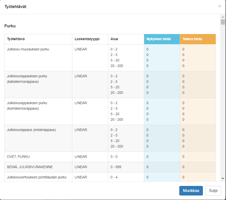 Uusi ikkuna avautuu, jossa voi tarkastella tehtävän työtehtäviä nykyisillä hinnoilla.