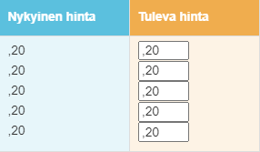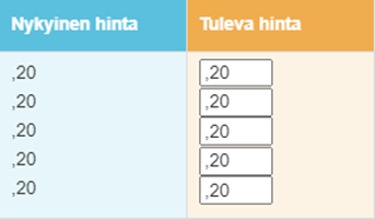 Hintoihin saa tehtyä muutoksia, klikkaamalla Muokkaa -painiketta oikeassa alakulmassa. Tehdyt muutokset tallennetaan painamalla Tallenna -painiketta. Blokkihinnat seuraavat aktivointipäivää samalla tavalla kuin muut hinnat.