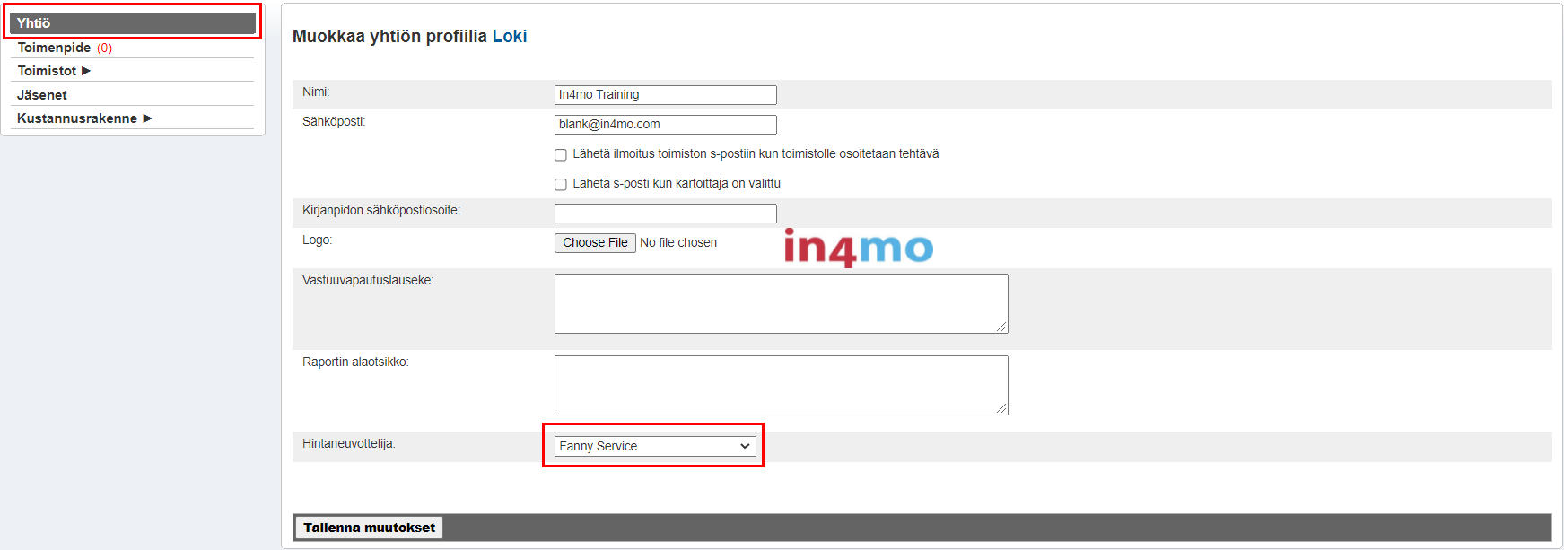 Ennen kuin kumppaniyritys voi tarkastella, asettaa ja hyväksyä hintoja, on yritykselle asetettava hintaneuvottelija. Vain hintaneuvottelijalla on pääsy yrityksen pääkäyttäjäsivuilla olevaan kustannusrakenneosioon. Hintaneuvottelijan saa asetettua kohdassa Yrityksen pääkäyttäjä > Yritys. Kohdassa Hintaneuvottelija löytyy pudotusvalikko käyttäjistä, joista voi valita hintaneuvottelijan.