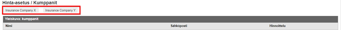 iCC hintoja voi vakuutusyhtiöissä hallita ne käyttäjät, joilla on valtuutustaso 6 ja käyttäjät, joilla on Kumppanipäällikkö rooli. Hintoja hallinnoidaan kohdassa