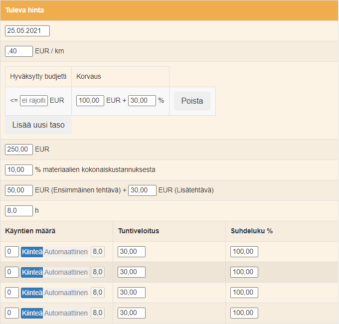Matkakorvausta varten uudet hinnat tai asetukset aktivoidaan vain tehtäville, jotka luodaan hintojen aktivoinnin jälkeen. Tämä ei koske tehtäviä, jotka olivat tapauksissa jo olemassa hintojen aktivoinnin yhteydessä.