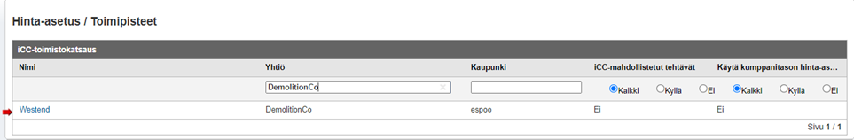 Kun haluttu kumppani on löydetty, määritetyt hinnat kyseiselle kumppanille saa näkyville, klikkaamalla kumppanin nimeä sarakkeessa Nimi.