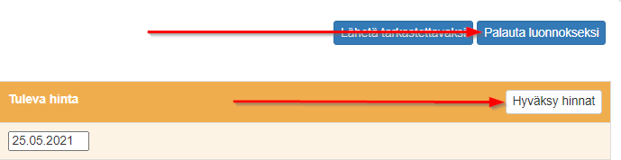 Mikäli kaikki on valmista, tulevan hintasarakkeen oikeassa yläkulmassa on painike Hyväksy hinnat.