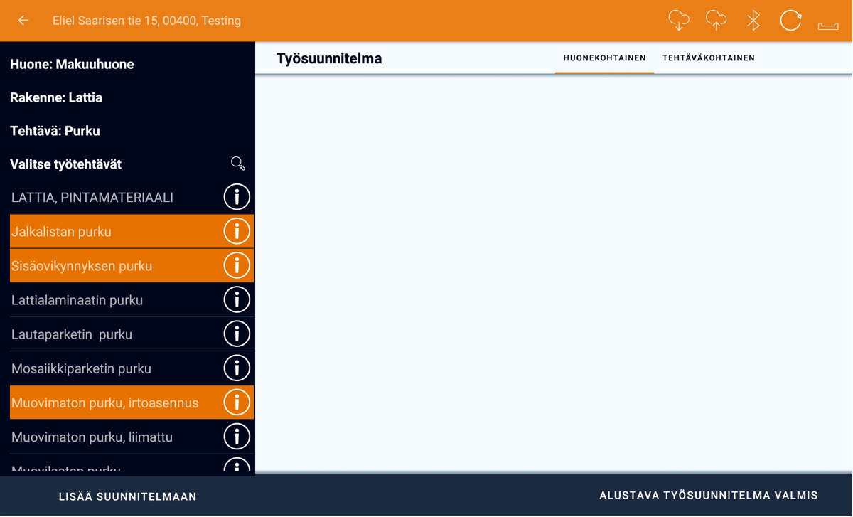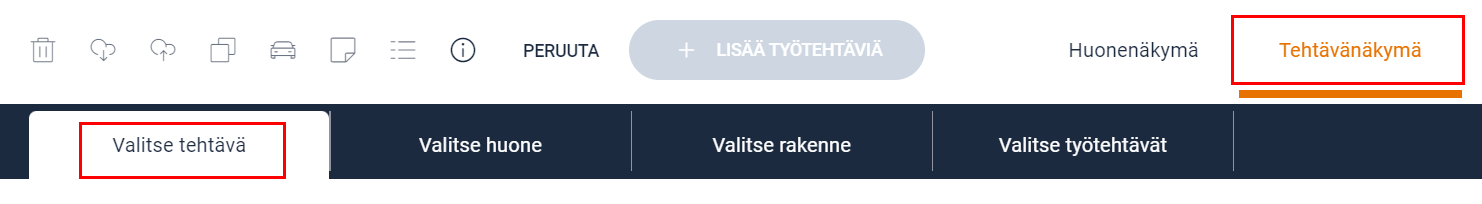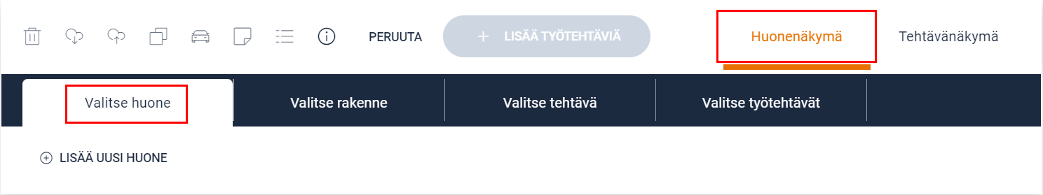 Kun uuden työsuunnitelman aloittaa tai uusia tehtäviä tai huoneita lisätään, työtehtäviä voi lisätä klikkaamalla + LISÄÄ TYÖTEHTÄVIÄ -painiketta. Riippuen siitä, onko Huone- vai Tehtävänäkymä valittuna, työsuunnitelman näkymä on hieman erilainen, seuraavien vaiheiden suorittamisjärjestyksestä johtuen.