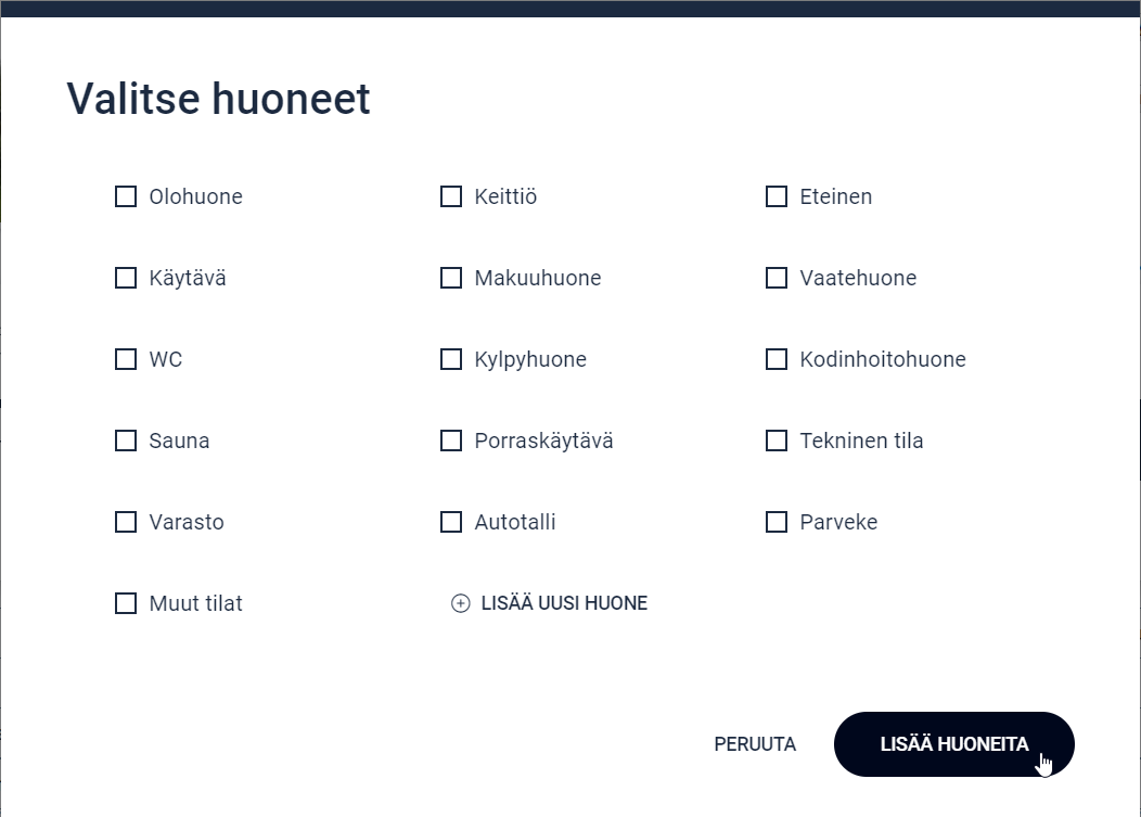 Kun huoneen valitsee ensimmäistä kertaa, kyseiset huoneet on ensin lisättävä. Tällä rajataan seuraavissa vaiheissa valittavana olevia vaihtoehtoja. Huoneita on aina mahdollista lisätä myöhemmin.