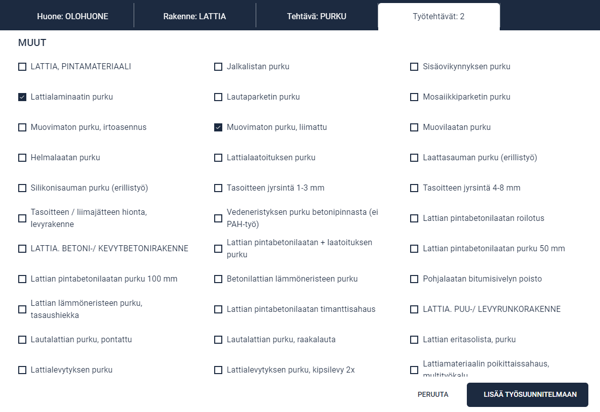 Mikäli järjestelmä noudattaa tehtävänäkymää, valitaan ensin tehtävä, esim. purku- tai timpurityöt. Kun tehtävä on valittu, on seuraavaksi valittava huone, jota seuraa rakenne, jolloin näkee tämän tehtävän ja rakenteen työtehtävät.