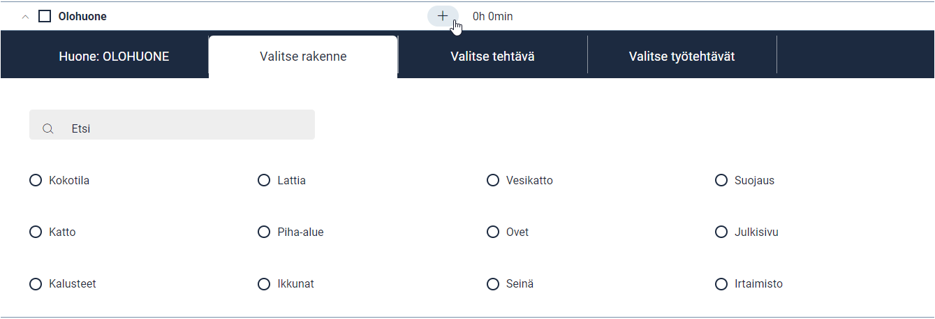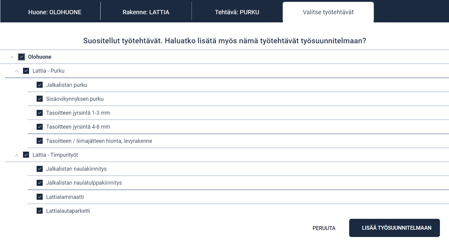 Kun huone, rakenne ja tehtävä on valittu, halutut työtehtävät voidaan valita.