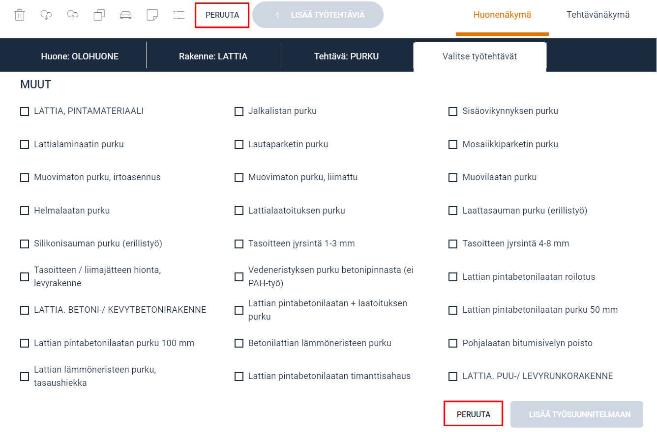 Valintanäkymästä voi poistua milloin tahansa klikkaamalla Peruuta, jolloin palaa takaisin työsuunnitelmaan.