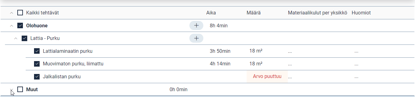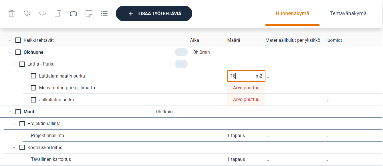 Kun työtehtäviä on lisätty, on lisättävä myös niiden määrä ja tarvittavat materiaalit. Nämä tiedot tarvitsevat työtehtävät on merkitty työsuunnitelmaan selvästi punaisella tekstillä, kun tiedot puuttuvat. Muistiinpanoja voi myös lisätä klikkaamalla Huomiot -sarakkeen alla olevia kolmea pistettä.