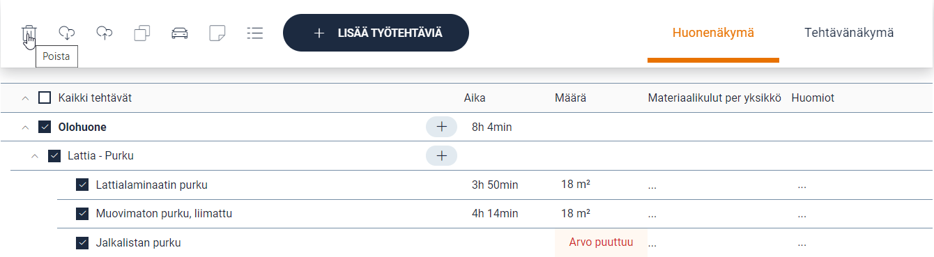 Poistettavat työtehtävät valitaan, klikkaamalla niiden tai rakenteen, tehtävän tai huoneen edessä olevia ruutuja. Tämän jälkeen klikataan poistopainiketta. Näyttöön tulee vahvistusikkuna varmistamaan, että virheiltä vältytään.