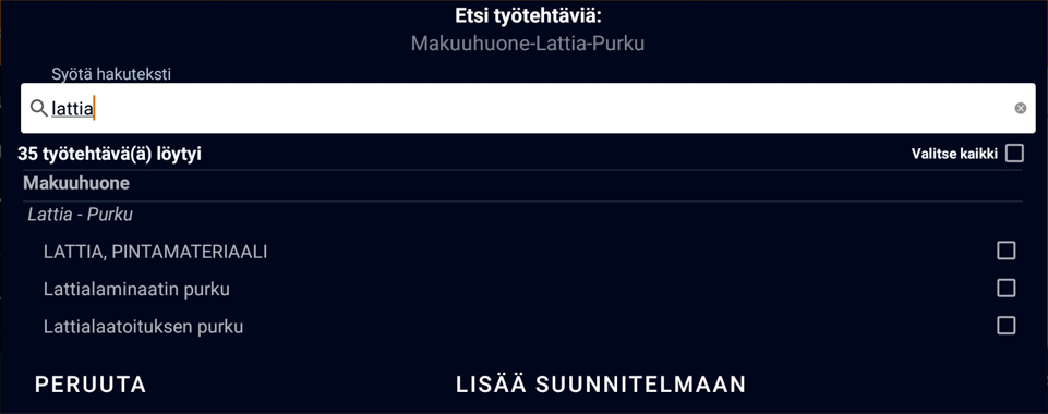 Kun on kirjoittanut tekstin hakukenttään, saa tuloksia haun perusteella. Tämän jälkeen, voi lisätä osan tai kaikki haun tuloksessa näkyvät työtehtävät.